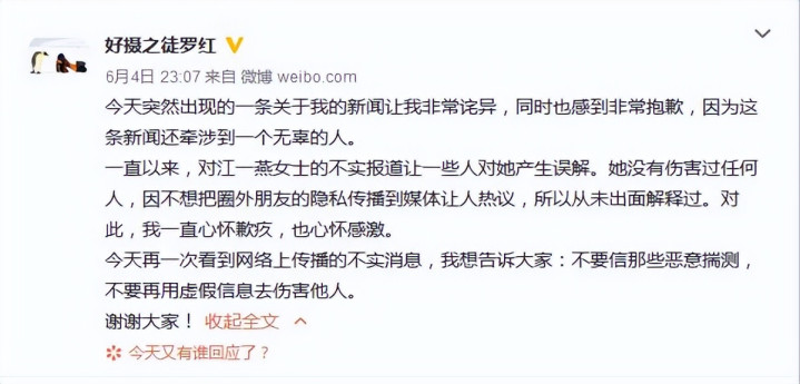 直到后来双方都辟谣,江一燕承认是朋友关系,罗红还向她道歉,很不好意思给她添了麻烦,公众这才明白,两人的确没有一腿。