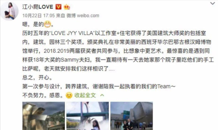 2019年,本来口碑甚好的江一燕,迎来了人设大翻车,有传言说她的才女人设是营销的,不知道通过什么手段,在国外拿了个“美国建筑大师奖”。