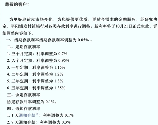 平阳浦发村镇银行网站消息,该行发布公告称,自10月21日起将实施新一轮存款利率调整。相比此前水平,整存整取定期存款三个月、六个月、一年、两年、三年及五年期产品,分别下调40个、35个、35个、50个、80个和80个基点。