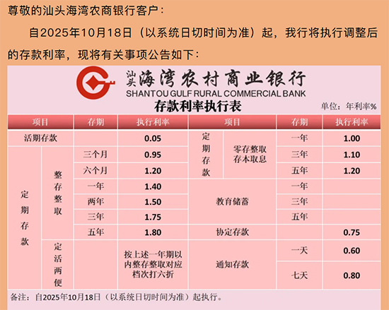 同样在近期,汕头湾海农商银行也加入了下调行列。自10月18日起,该行定期存款整存整取三个月、六个月、一年、两年、三年及五年期年化利率,分别调整为0.95%、1.20%、1.40%、1.50%、1.75%和1.80%,整体较此前下调15至20个基点。