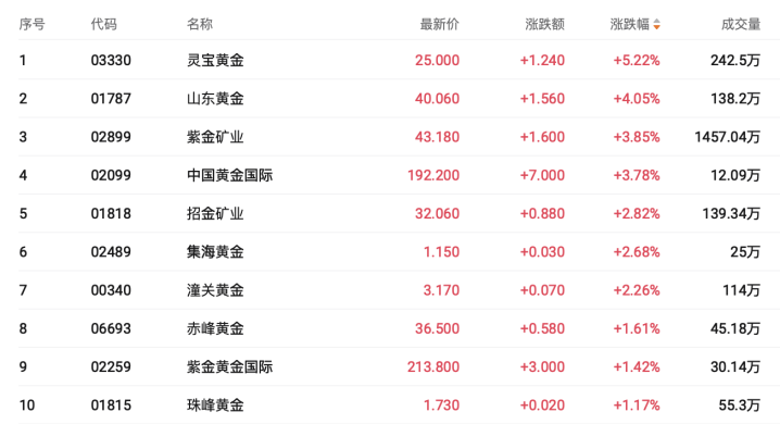财联社2月16日讯(编辑胡家荣)今日港股黄金板块表现活跃,多只标的涨幅显著。截至发稿,灵宝黄金(03330.HK)涨5.22%、山东黄金(01787.HK)涨4.05%、紫金矿业(02899.HK)涨3.85%、中国黄金国际(02099.HK)涨3.78%。