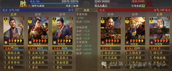 阵容实战总结:兄弟们看完后对于吕布应该有了新的认识,别再说这个武将打不出高战功了,只要有一定的红度,在战法兵书和宝物搭配合理的情况下,诸位也可以打出类似连穿的强度,如果红度更高宝物更好的话,哪怕是天下无双的连穿横幅也一样有机会,玩腻了带左慈组温候弓的兄弟可以尝试组起来玩玩!